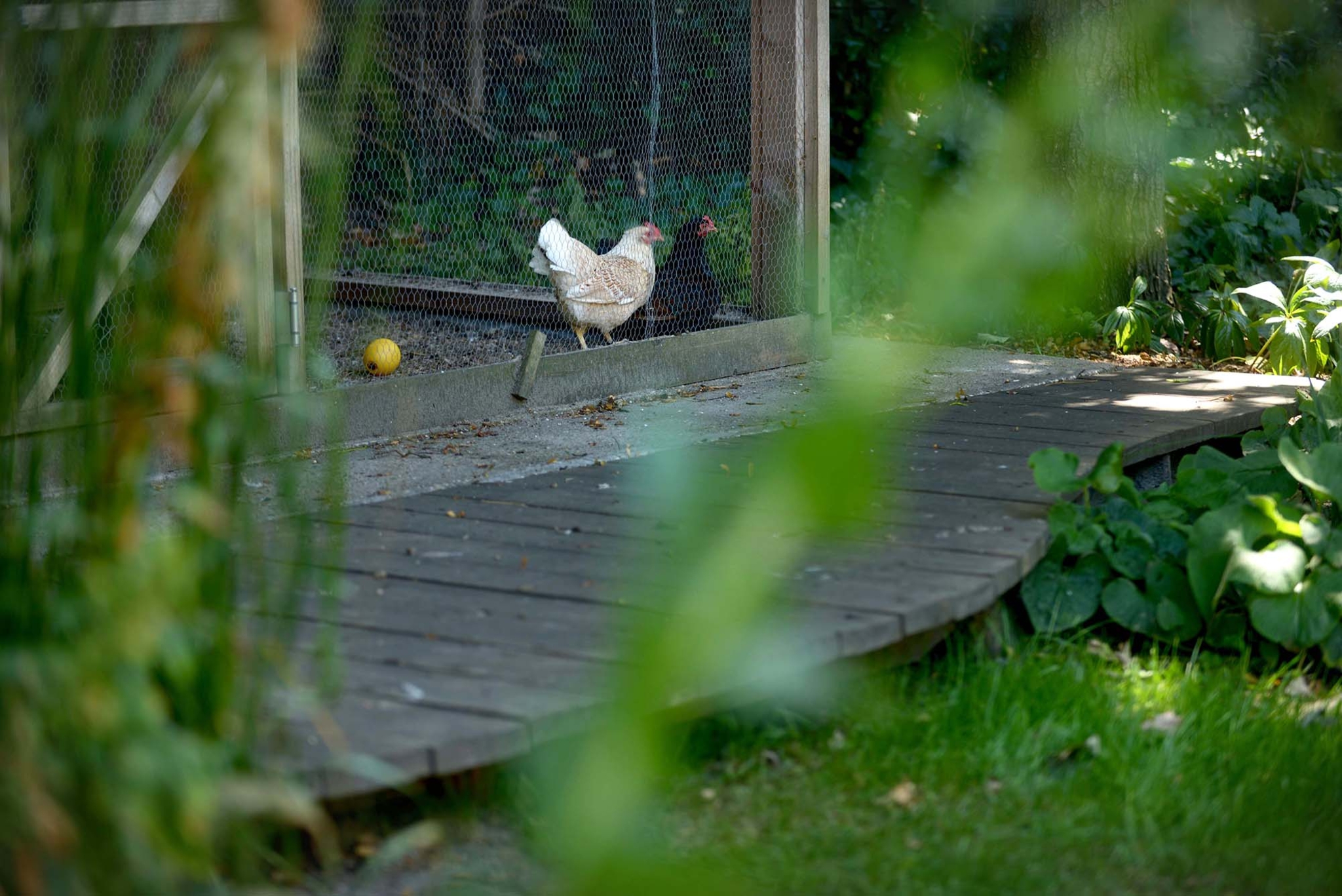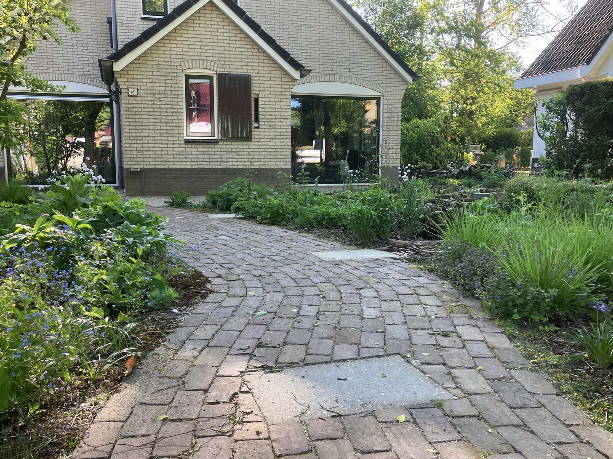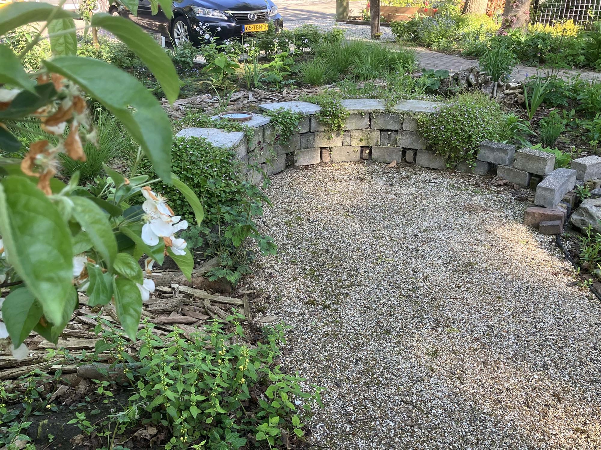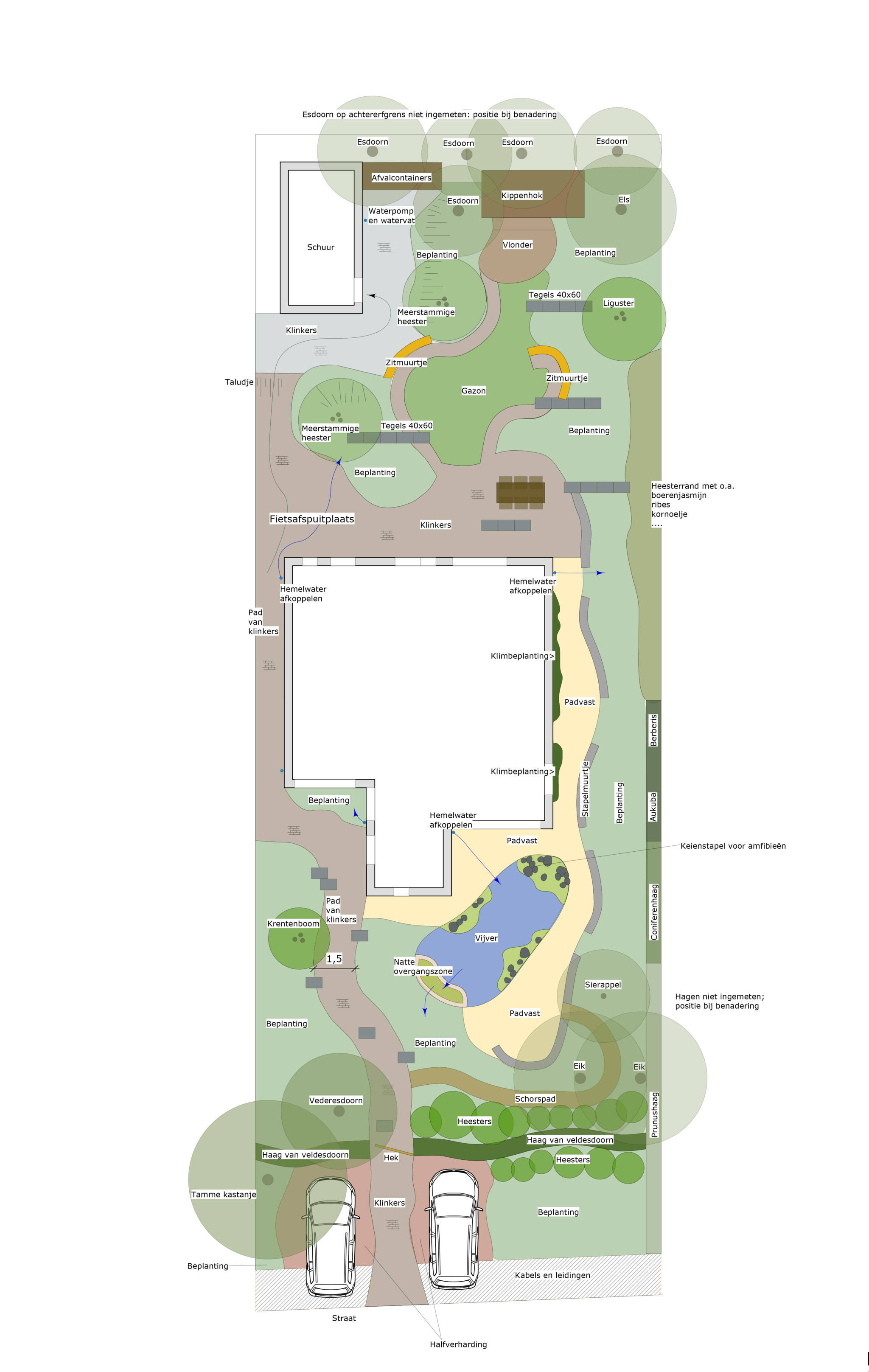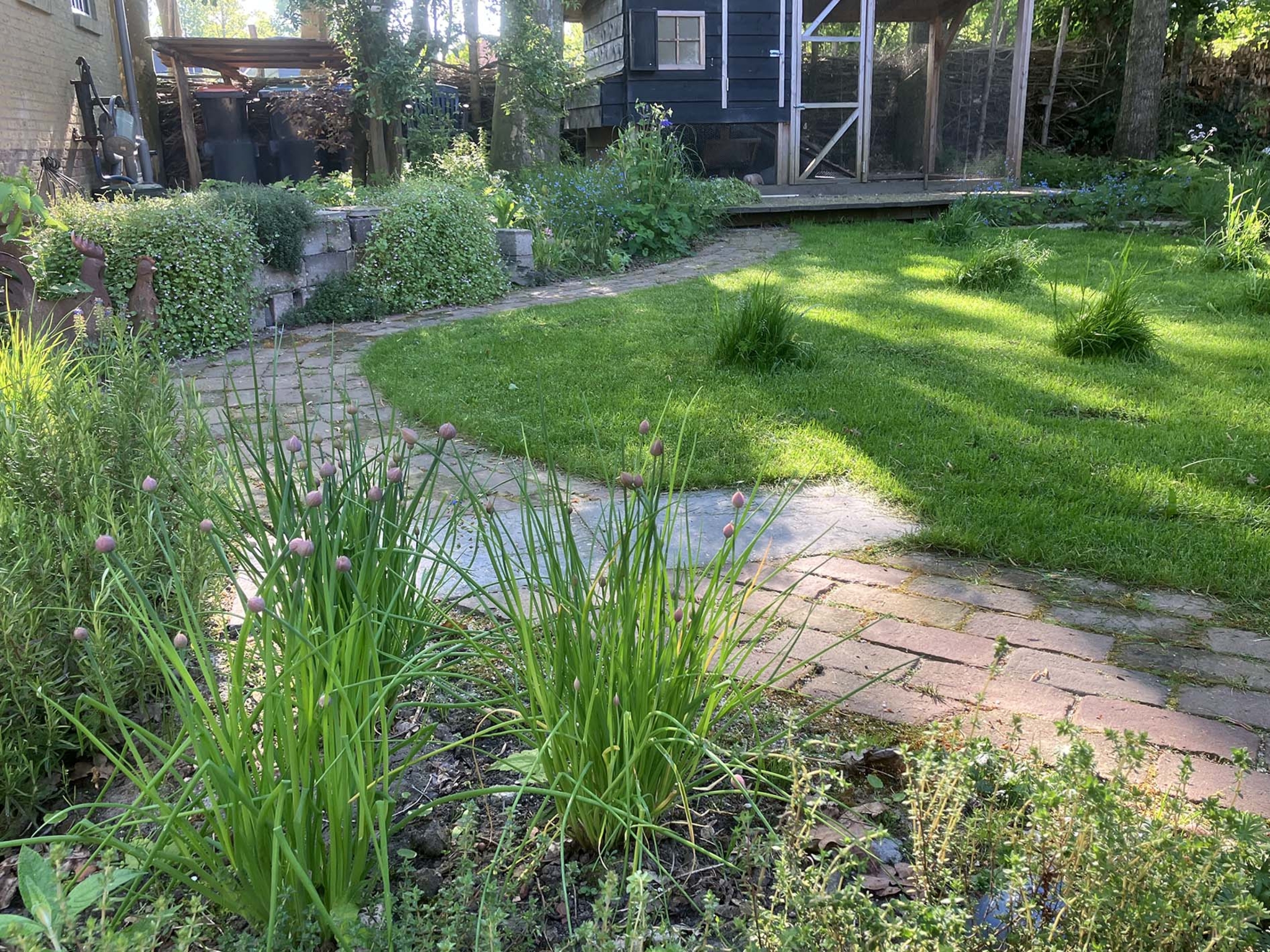 Slingerende paadjes langs en tussen de beplanting zorgen ervoor dat je overal makkelijk kan komen. Er zijn gezellige plekjes om tussen het groen te zitten, zelfs bij de kippen. Leuk om ze te zien hoe ze rondscharrelen! Zitmuurtjes en stapelingen met stammetjes verspreid door de tuin, zorgen voor porositeit, waardoor er plantjes tussen gaan groeien en insecten, egels, kikkertjes en salamanders er voedsel en schuilgelegenheid kunnen zoeken. Natte en droge plekjes wisselen elkaar af wat veel variatie biedt voor dieren. Er ontstaat zo een resilient garden (veerkrachtige tuin) die zich weerbaar maakt en goed bestand is tegen de klimaatinvloeden.