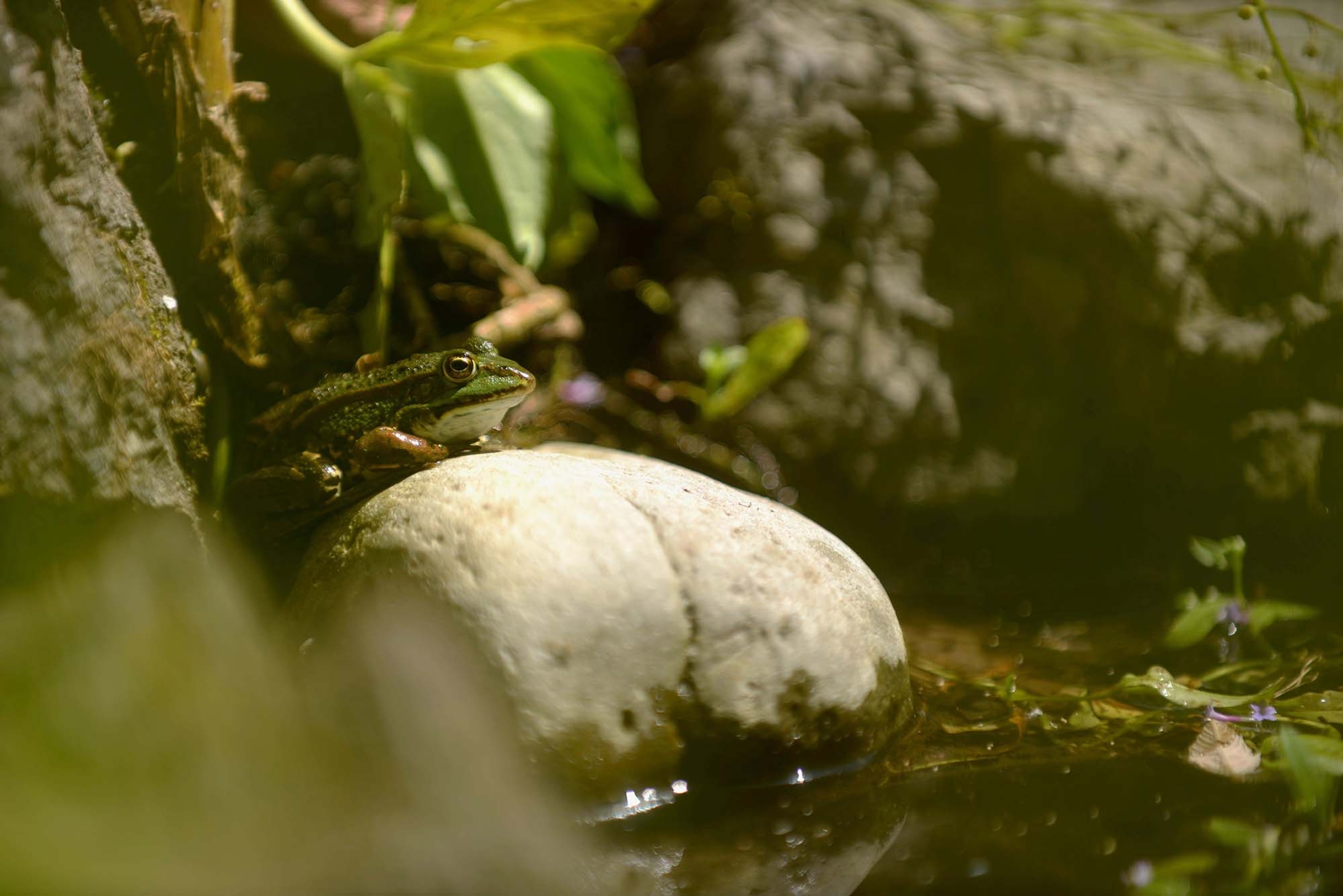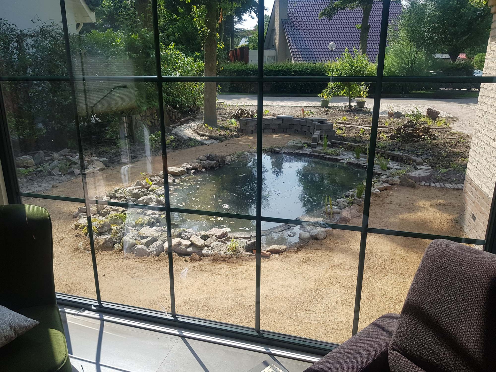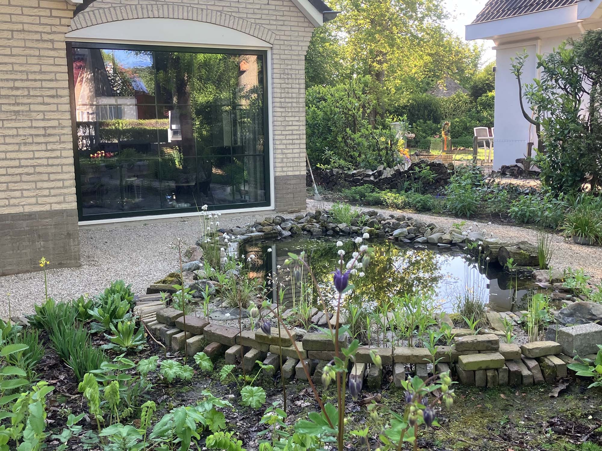 Vanuit de woonkamer heb je een mooi zicht op de vijver. Je kijkt op het water en kan allemaal diertjes zien; libelles, kikkertjes, drinkende vogels, vlinders, bijen, allemaal bewegen ze zich om de vijver, op het water en tussen de planten. De organische vormen en lijnen zorgen ook voor beweging en meanderen door de tuin. Het zorgt voor natuurbeleving van dichtbij!