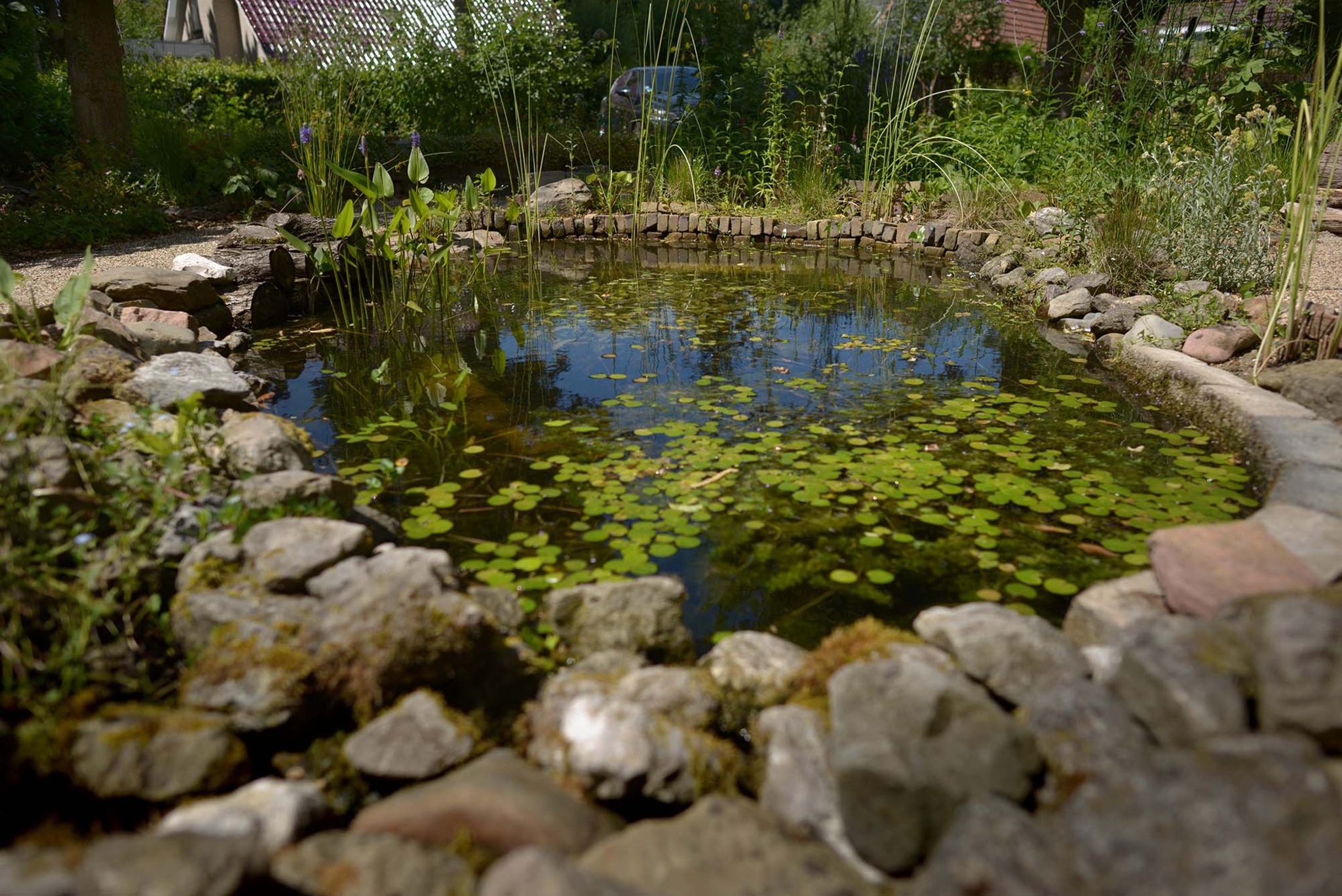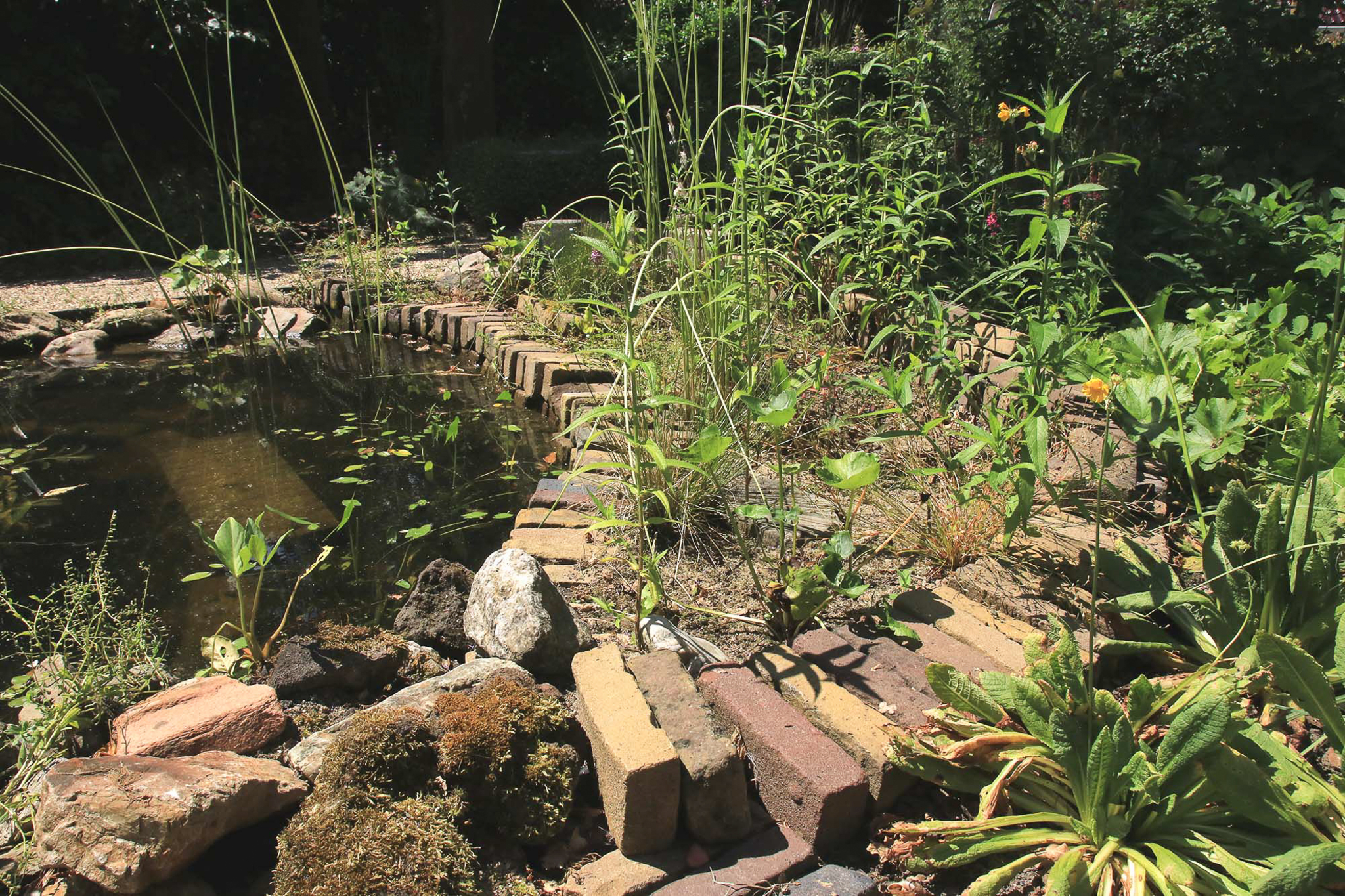 Deze tuin lijkt op een spons! Het regenwater wordt aan alle kanten opgevangen. In periodes van droogte is er zo een betere groei van planten. De vijver wordt voor een deel gevoed met regenwater wat via de regenpijp naar de vijver loopt. Bij veel regen loopt het water via een overgangszone naar verlagingen in de beplanting. Daar zakt het in de ondergrond en vormt een buffer voor tijden van droogte. Ook in de achtertuin wordt het regenwater gebufferd in verlagingen tussen de beplanting: vanaf een overloopse regenpijp aan de zijkant van de woning en via een regenpijp over dakpannen naar de planten.