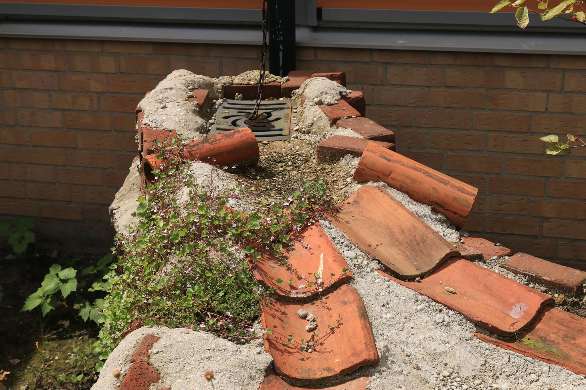 Belangrijk was gebruik te maken van het hemelwater. Door dit af te koppelen ontstaan er waterloopjes vanuit de verschillende regenpijpen naar de vijver in de patio. Op weg hiernaartoe kan het water infiltreren in poreuze muurtjes en als een buffer tussen de beplanting in de tuin. In tijden van droogte kan de beplanting daar gebruik van maken. Porositeit biedt plek aan insecten en plantjes. De vijver en nattere plekjes trekken waterdiertjes aan. Blauw en groen hebben van nature een magische aantrekkingskracht op zowel mensen als dieren.