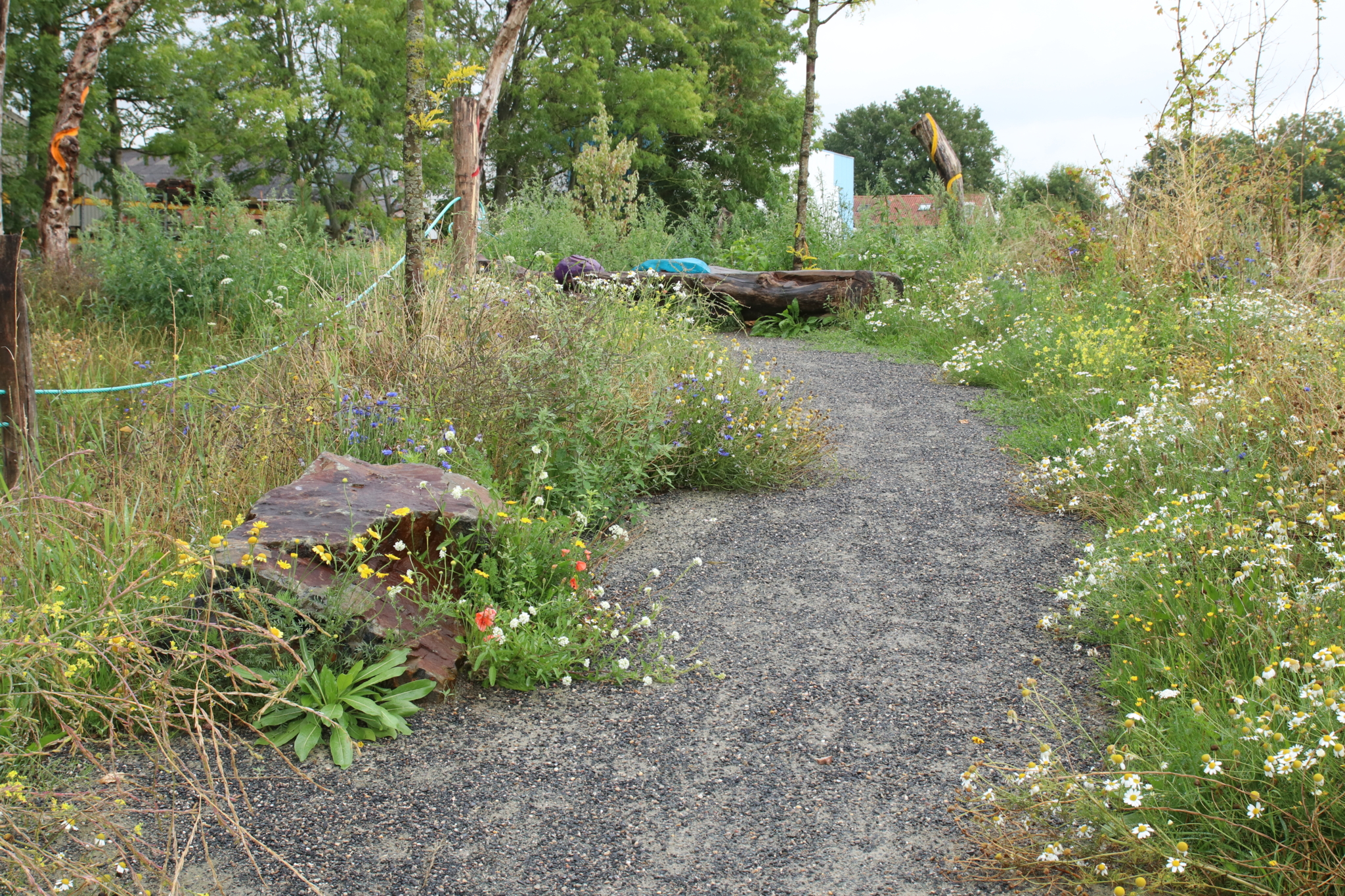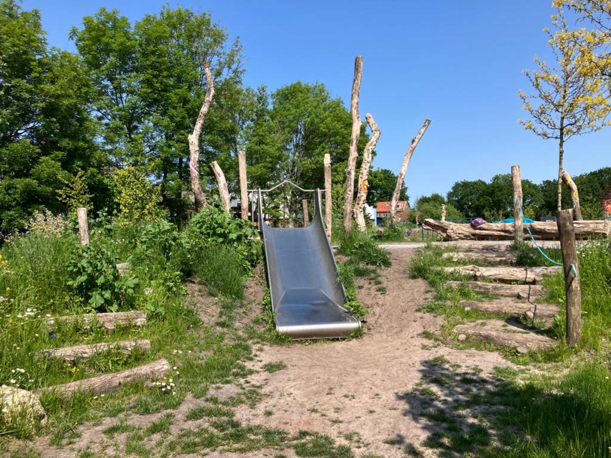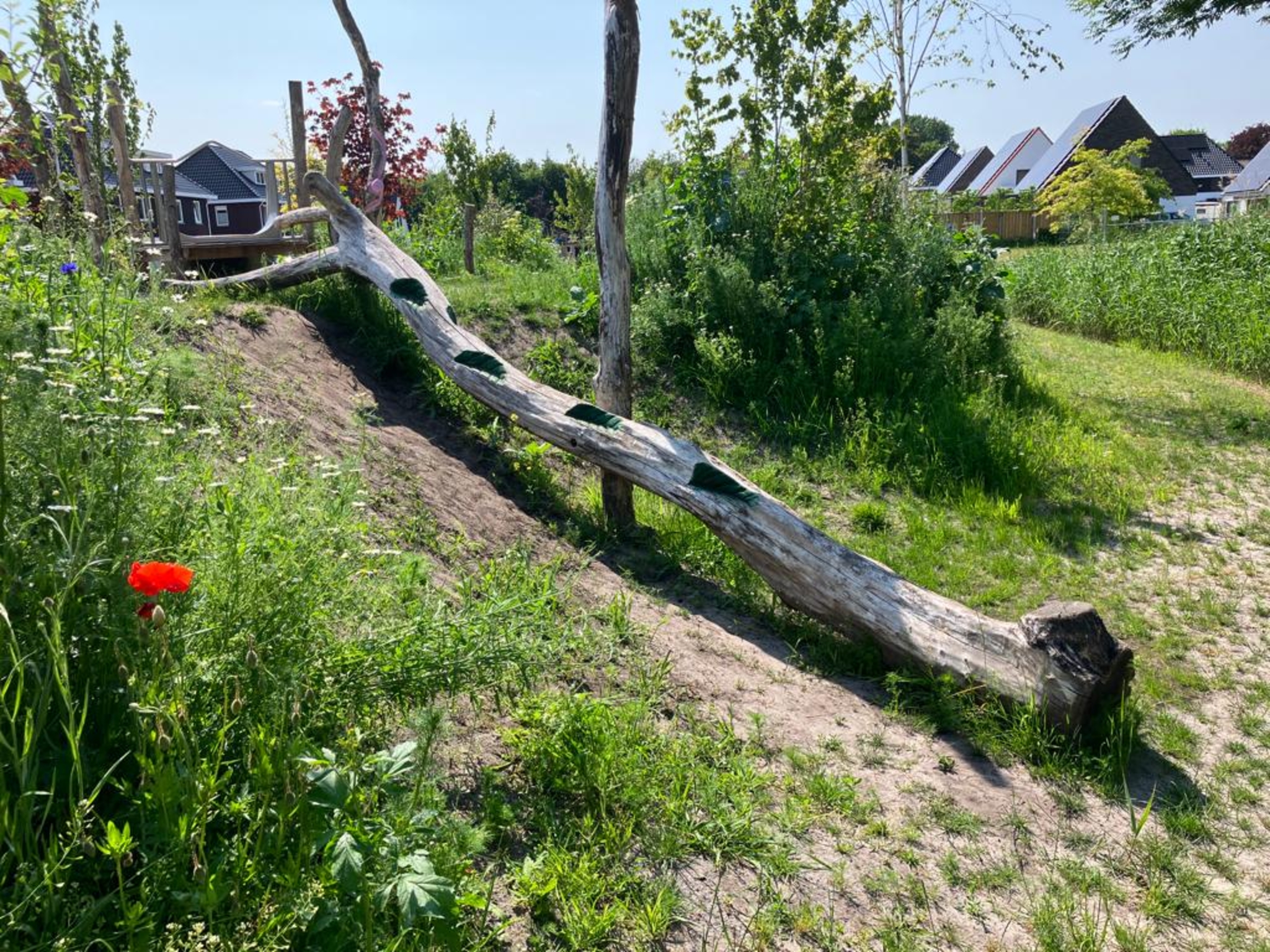 Op een aantal objecten zijn kleurcontrasten aangebracht. Voor slechtzienden zijn zo de speelpekken meer herkenbaar en het ziet er nog vrolijk uit ook. Bomen en struiken zorgen voor schaduw. Op het ernaast gelegen trapveldje kun je een potje voetbal spelen. Het is een speelplek geworden die voor álle kinderen de speelwaarde vergroot.