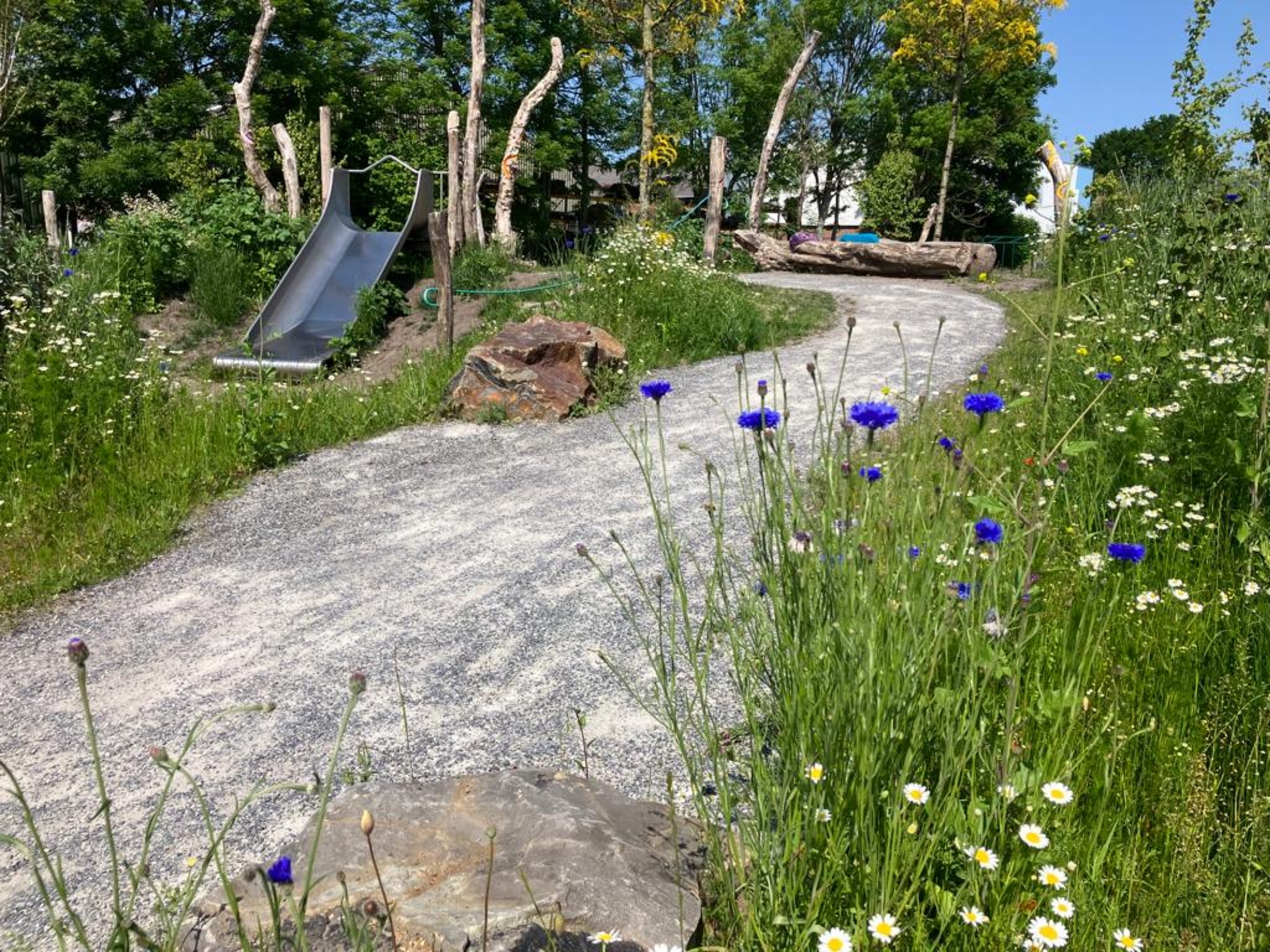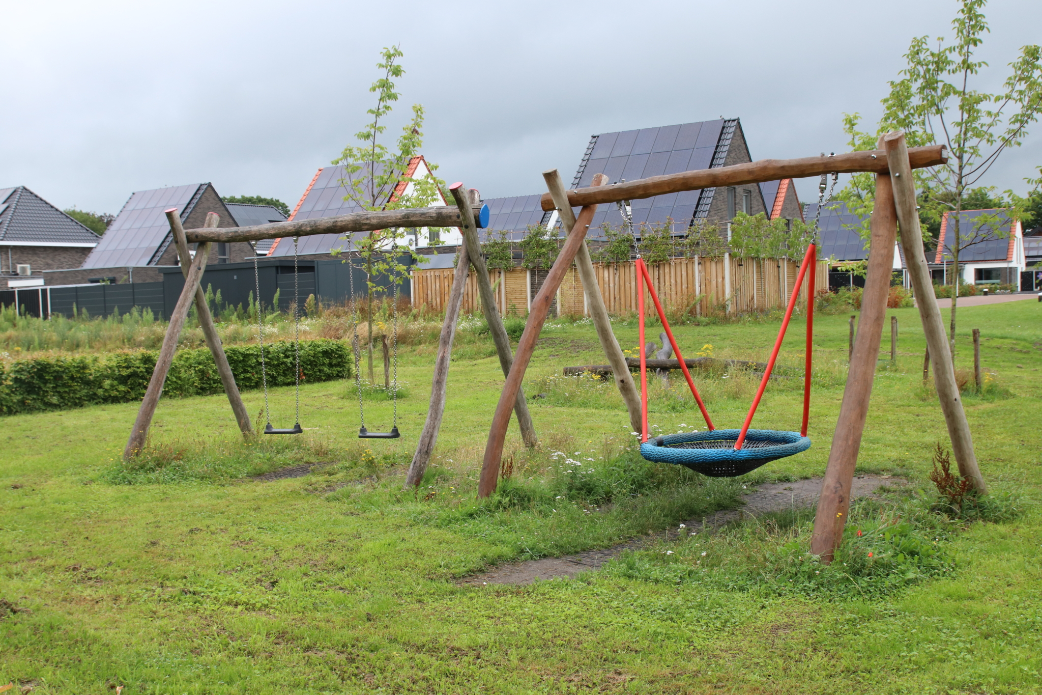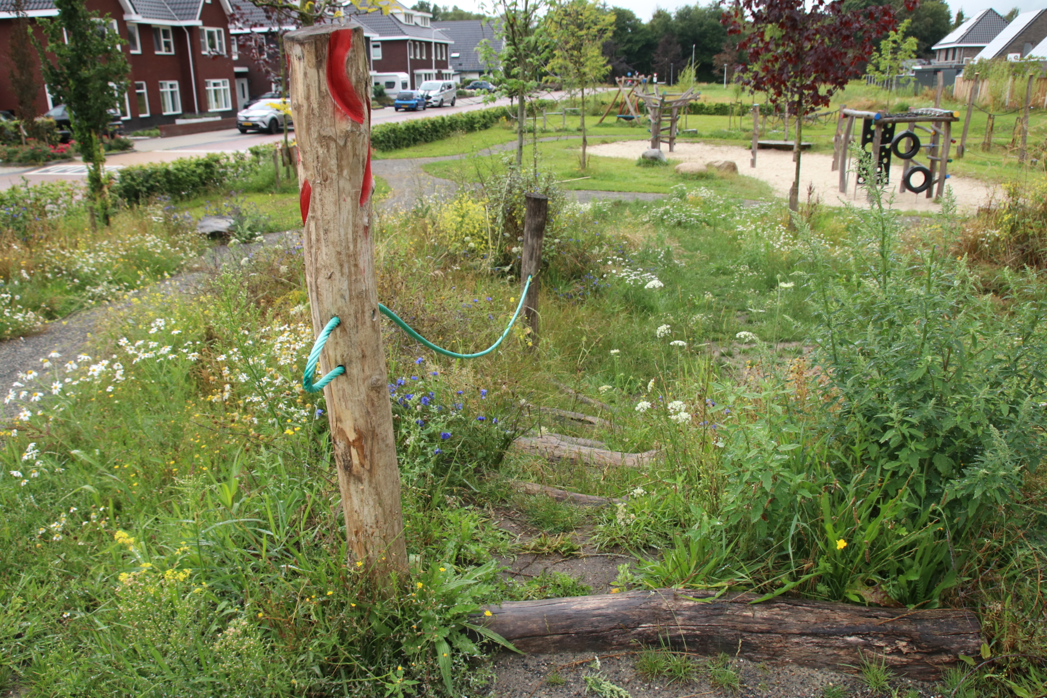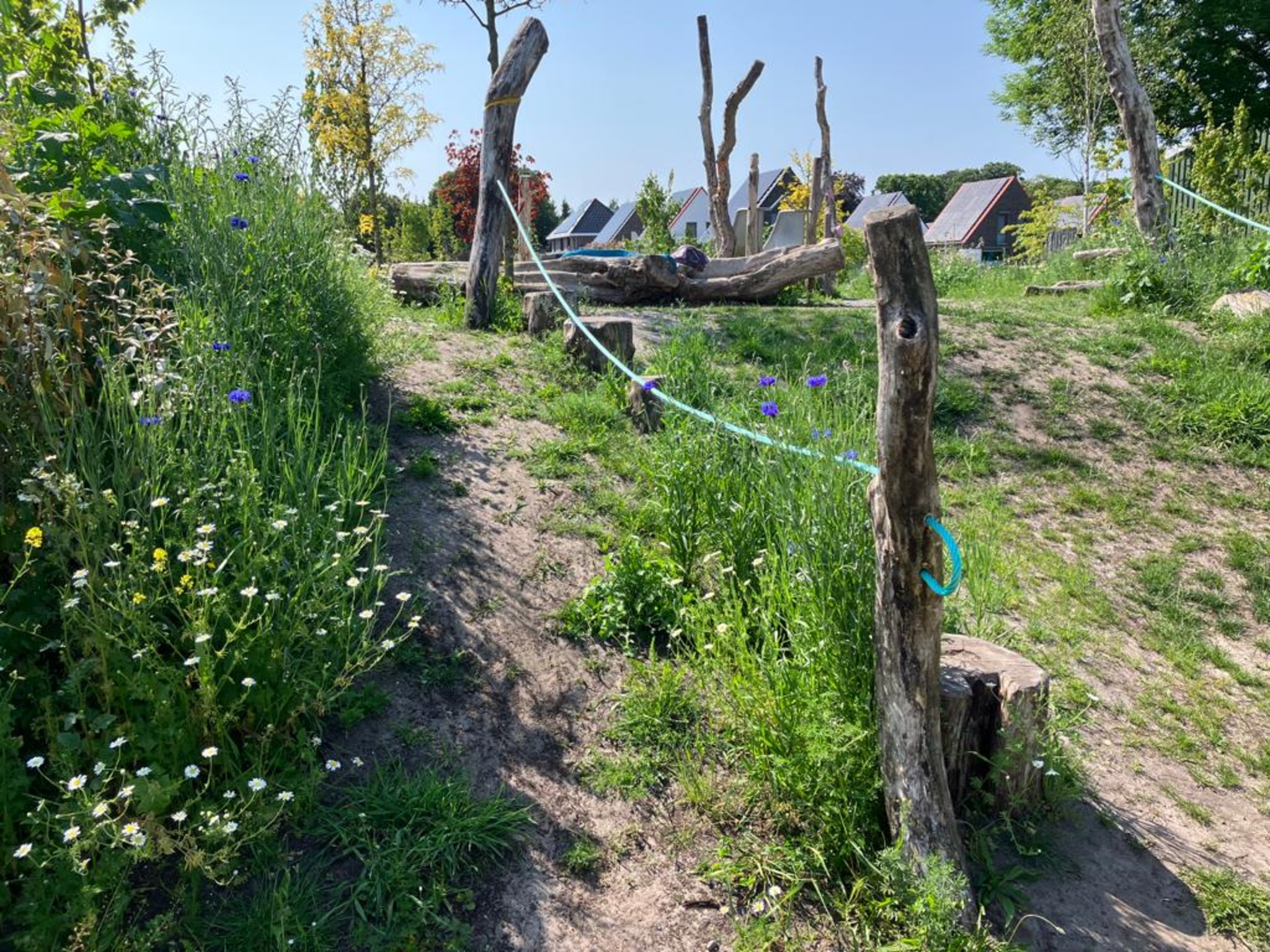 Op een aantal objecten zijn kleurcontrasten aangebracht. Voor slechtzienden zijn zo de speelpekken meer herkenbaar en het ziet er nog vrolijk uit ook. Bomen en struiken zorgen voor schaduw. Op het ernaast gelegen trapveldje kun je een potje voetbal spelen. Het is een speelplek geworden die voor álle kinderen de speelwaarde vergroot.