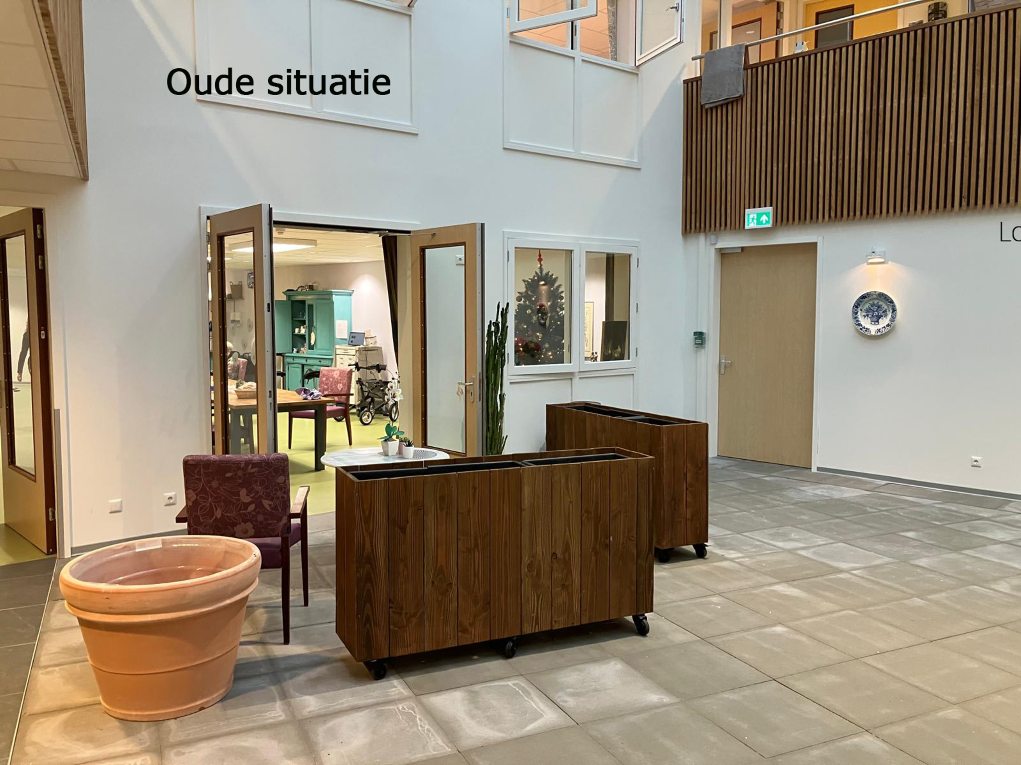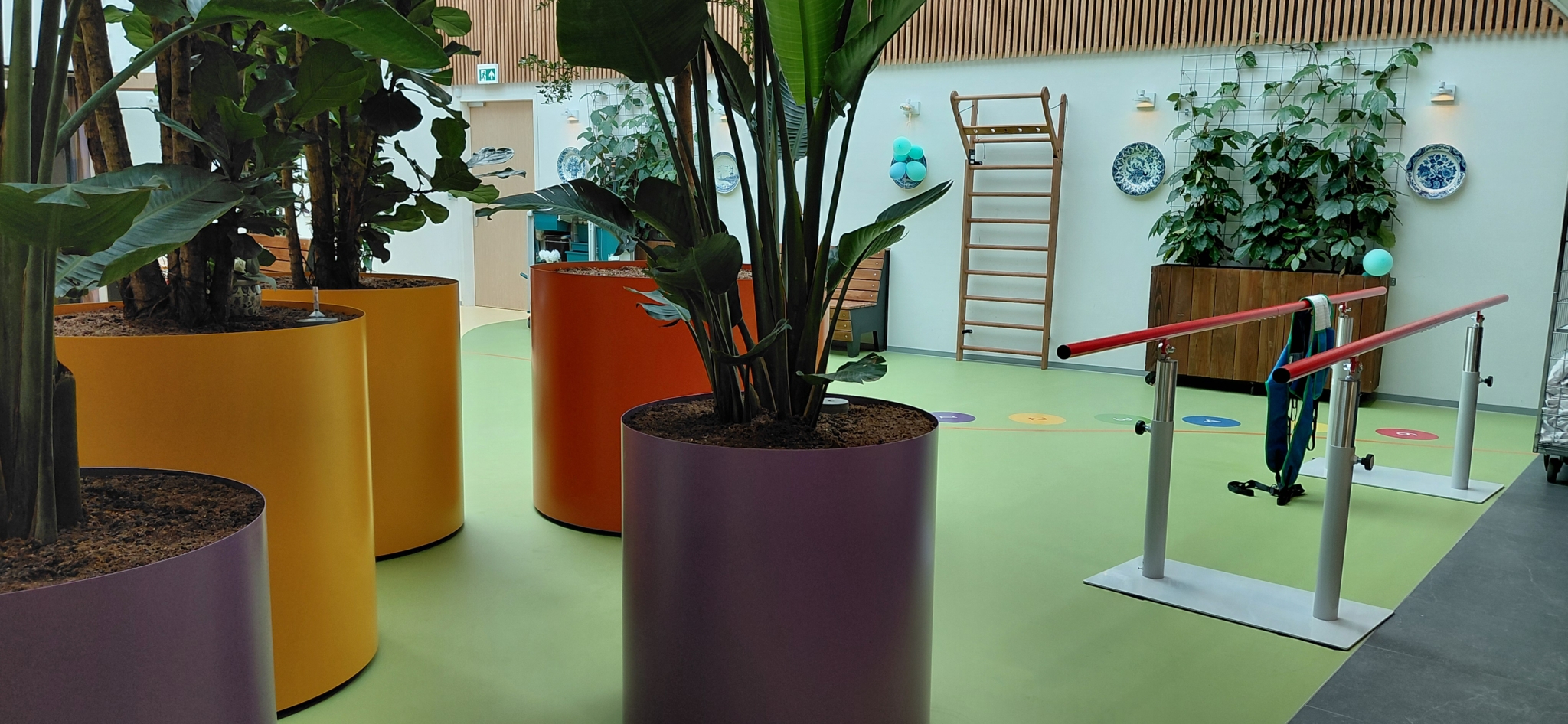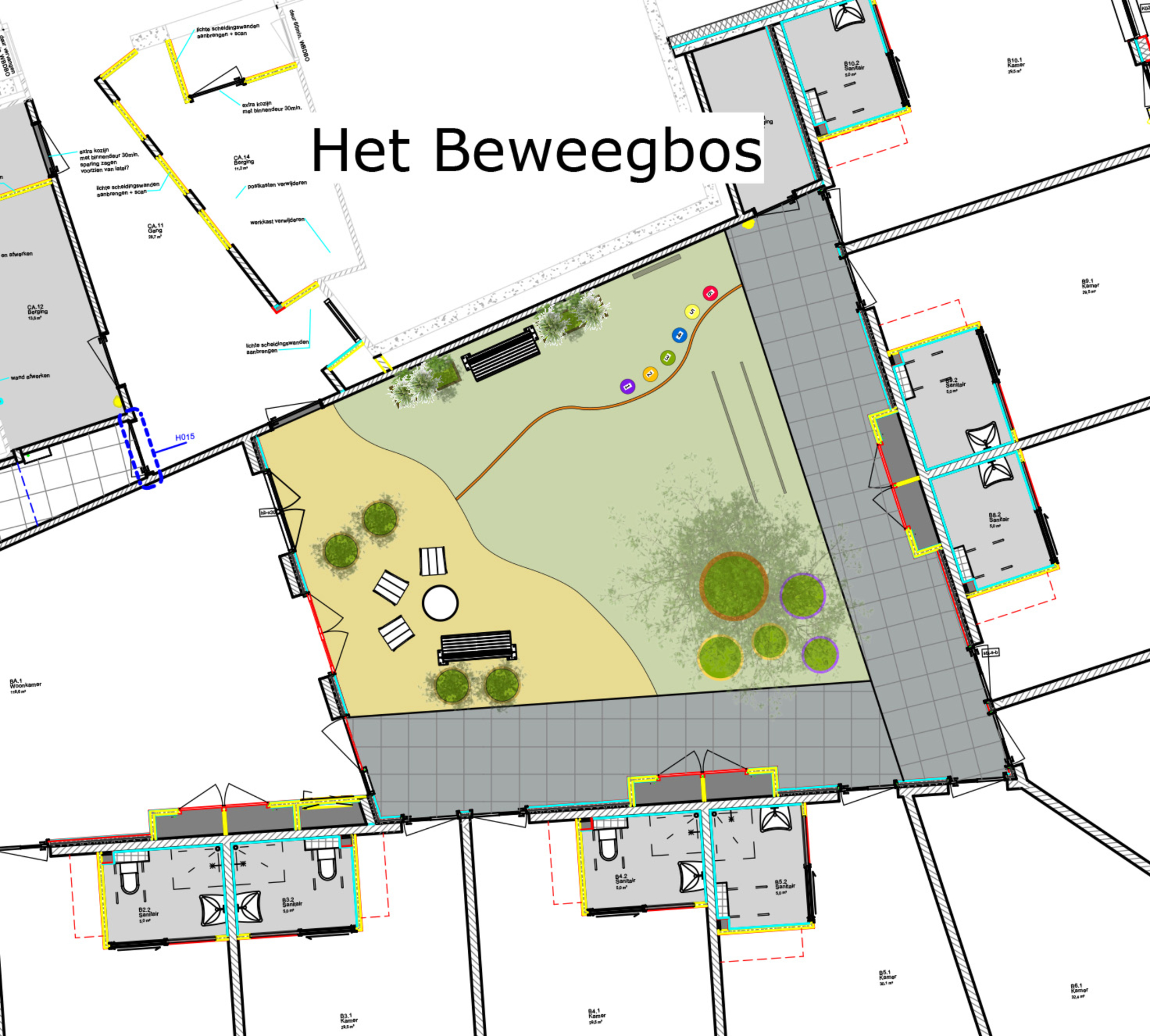 Het beweegbos is met zijn verschillende kleuren een plek geworden waar beweegoefeningen onder leiding van de fysiotherapeut gedaan kunnen worden, een plek is voor groepsspel en -beweging, en waar bewoners creatief bezig kunnen zijn. En dat met kamerplanten als bomen in vrolijke gekleurde plantbakken om hen heen.