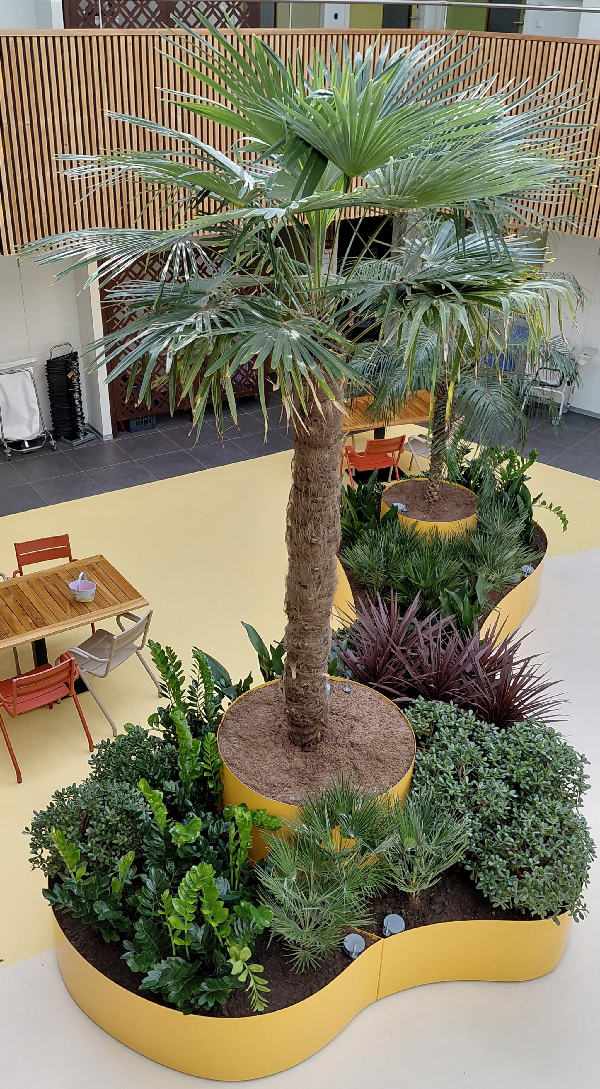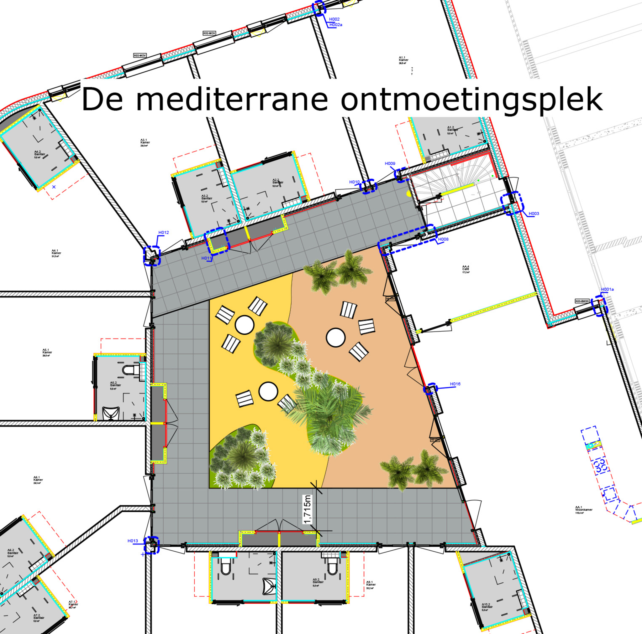 De mediterrane ontmoetingsplek ademt sfeer en warmte. De warme kleuren van de vloer en de organisch gevormde plantenbakken zijn op elkaar afgestemd. Uit de plantbakken rijzen grote palmbomen omhoog. Samen met een aantal zitplekjes geeft het je het gevoel of je op een mediterraans terras bent.