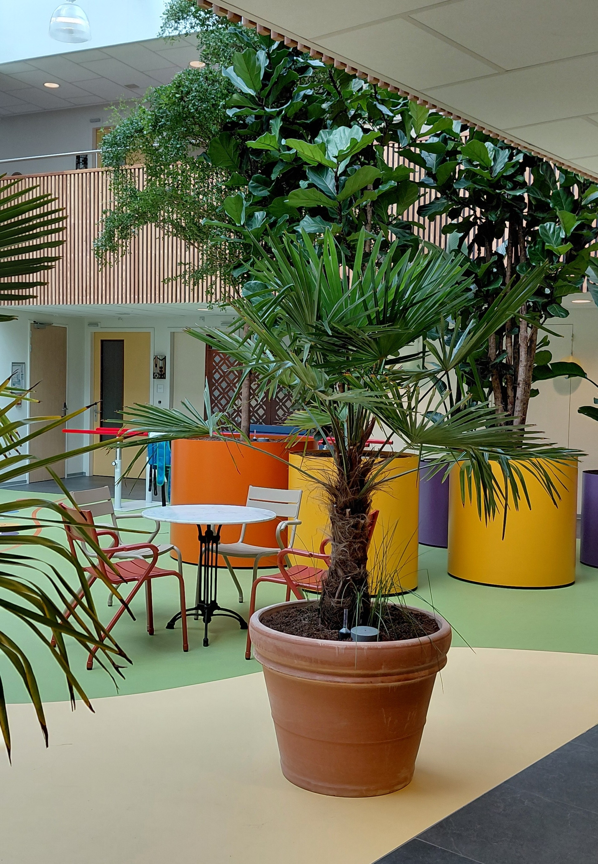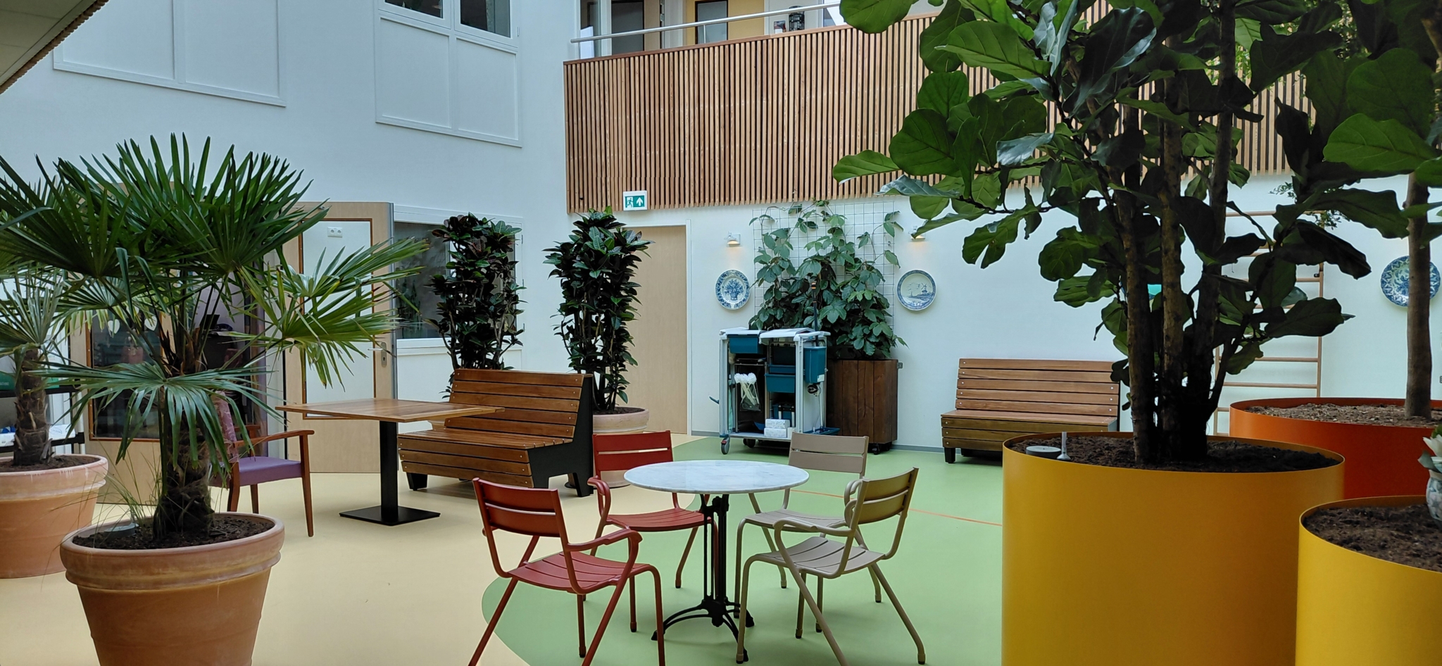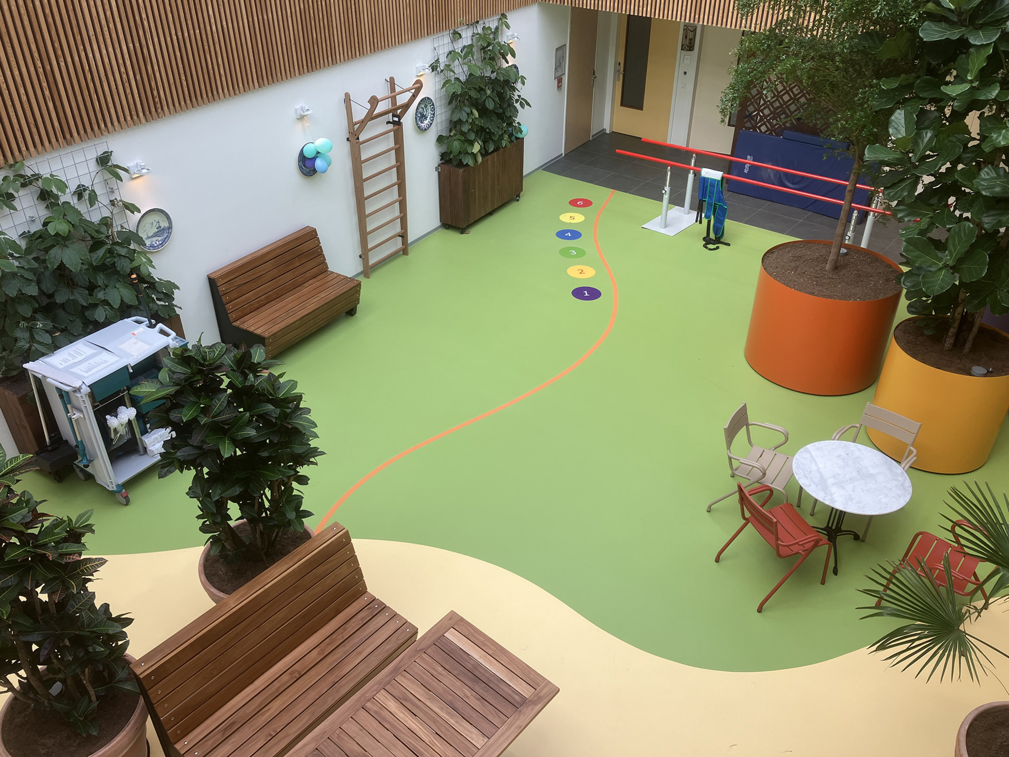 Wat een gezellige sfeer en groen is het geworden! De beide atriums van Woonzorg Hanzeborg in Lelystad zijn van saaie grijze ruimtes veranderd in twee kleurrijke vertrekken waar de bewoners elkaar ontmoeten, kunnen verblijven en bewegen. Ze genieten er van de groene sfeer die gemaakt is met kleurige plantbakken met kamerplanten en palmen die flink de hoogte in gaan. Ook de vloeren zijn veranderd van saaie grijze tegels in passende kleuren die goed bij de thema’s van de atriums passen: het beweegbos en de mediterrane ontmoetingsplek. Doordat het daglicht door het glazen dak komt zijn beide plekken heerlijk licht. Het zijn gezellige zonnige ruimtes geworden. Vanaf de eerste verdieping kijk je mooi van boven af op de ruimtes en kun je de toppen van de planten bijna aanraken.
