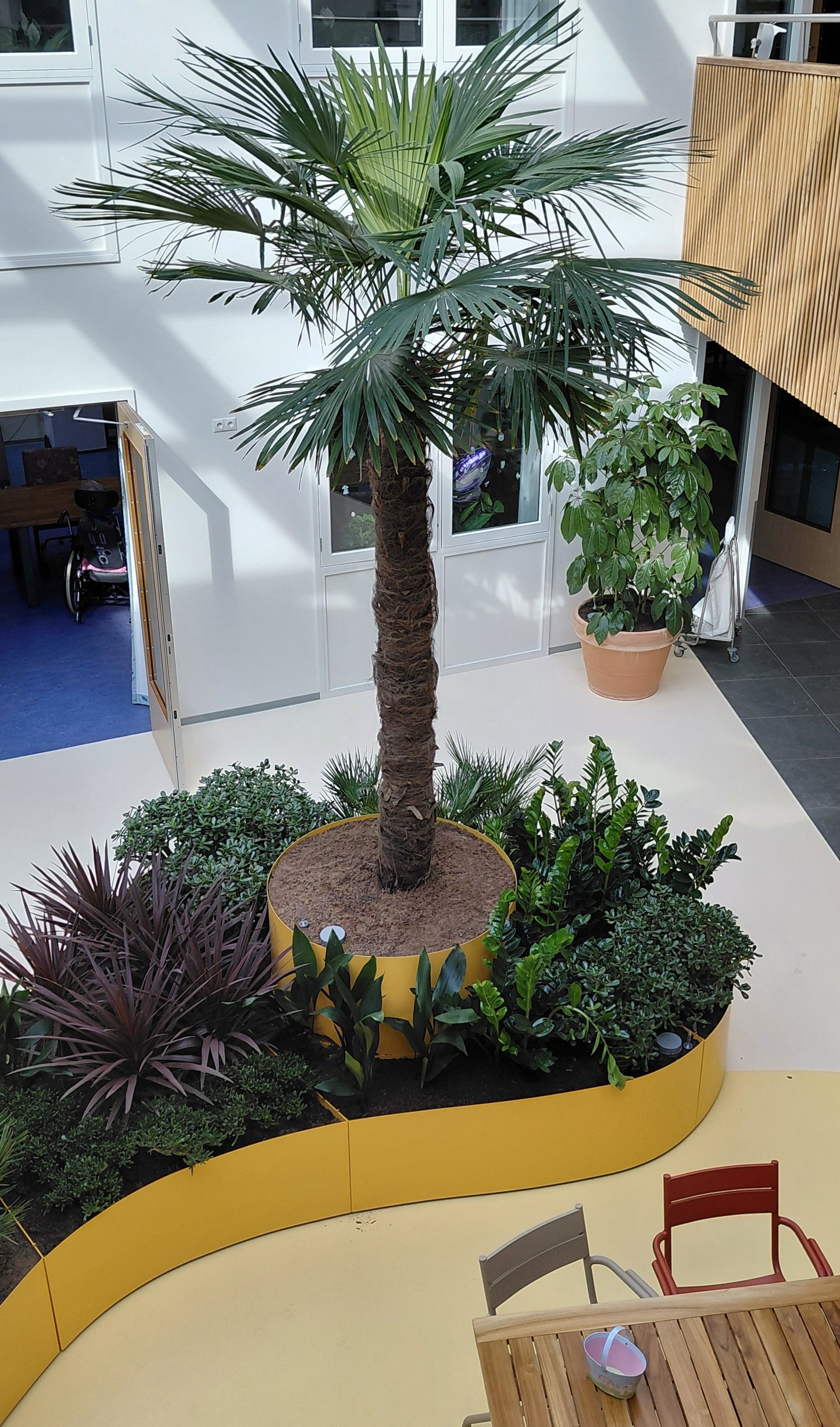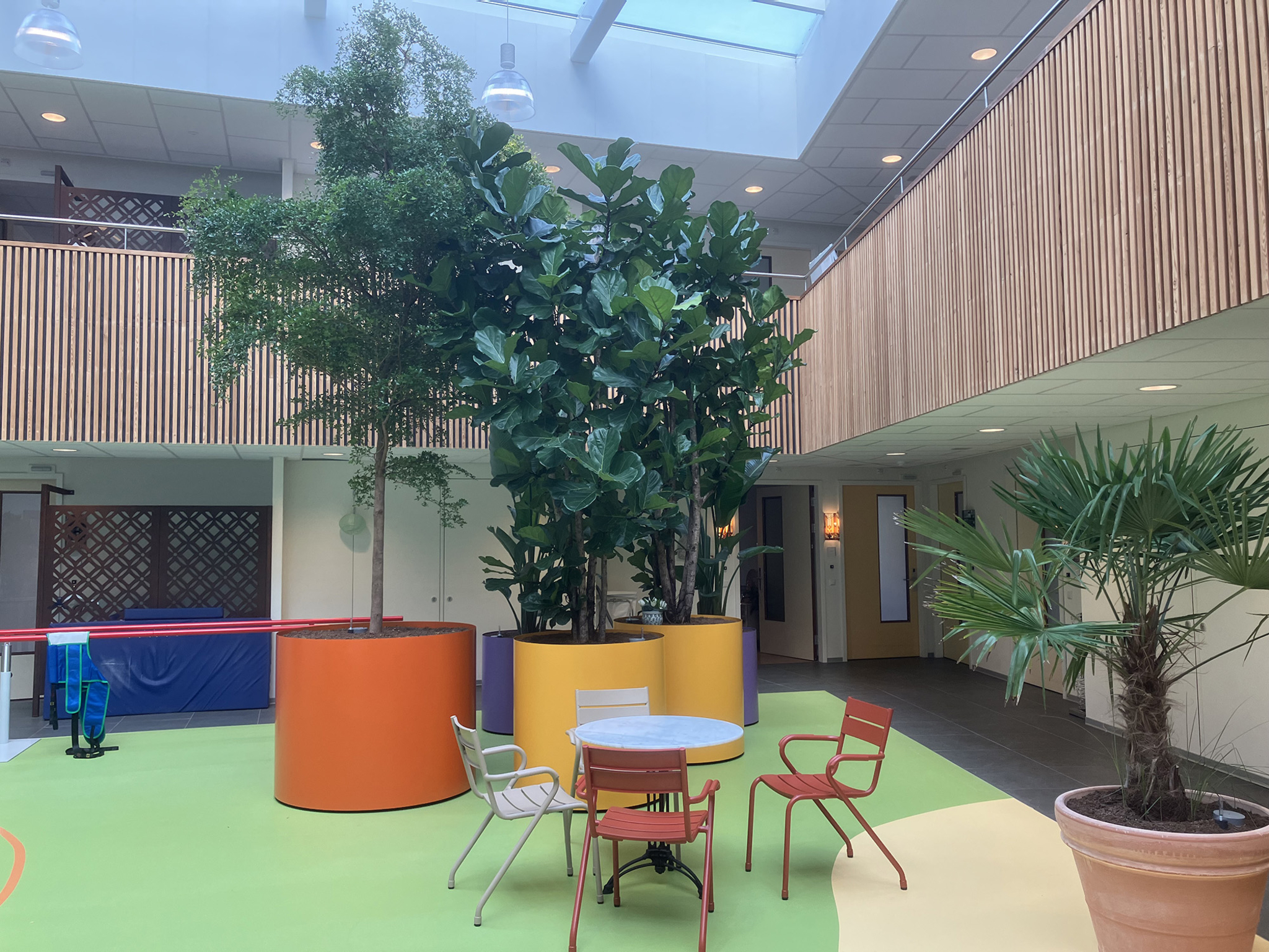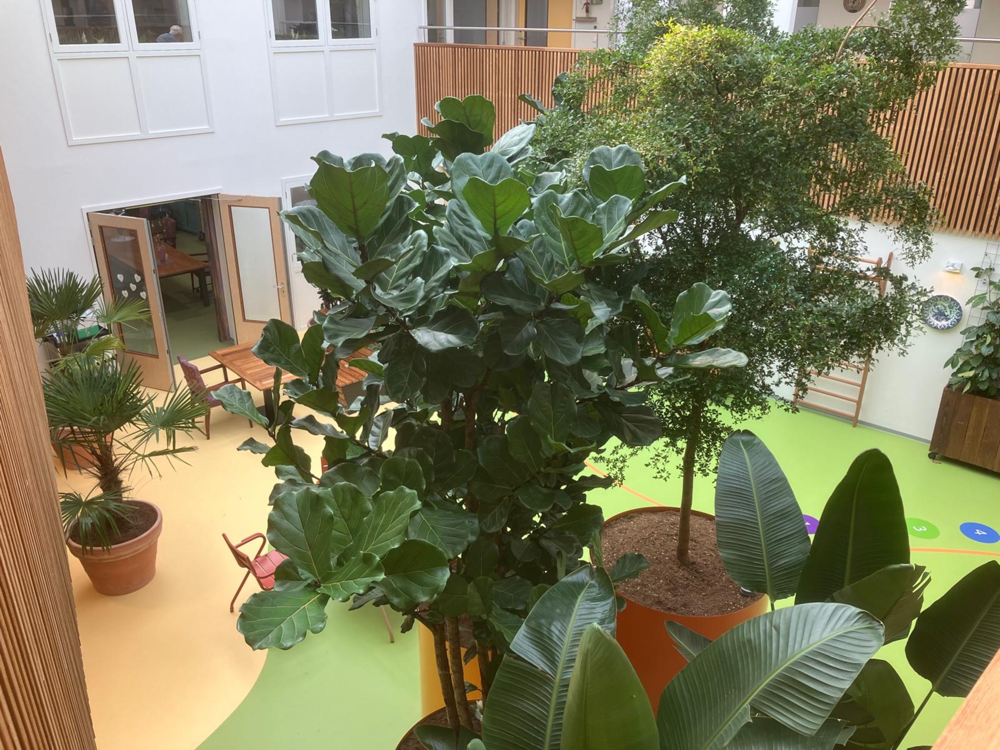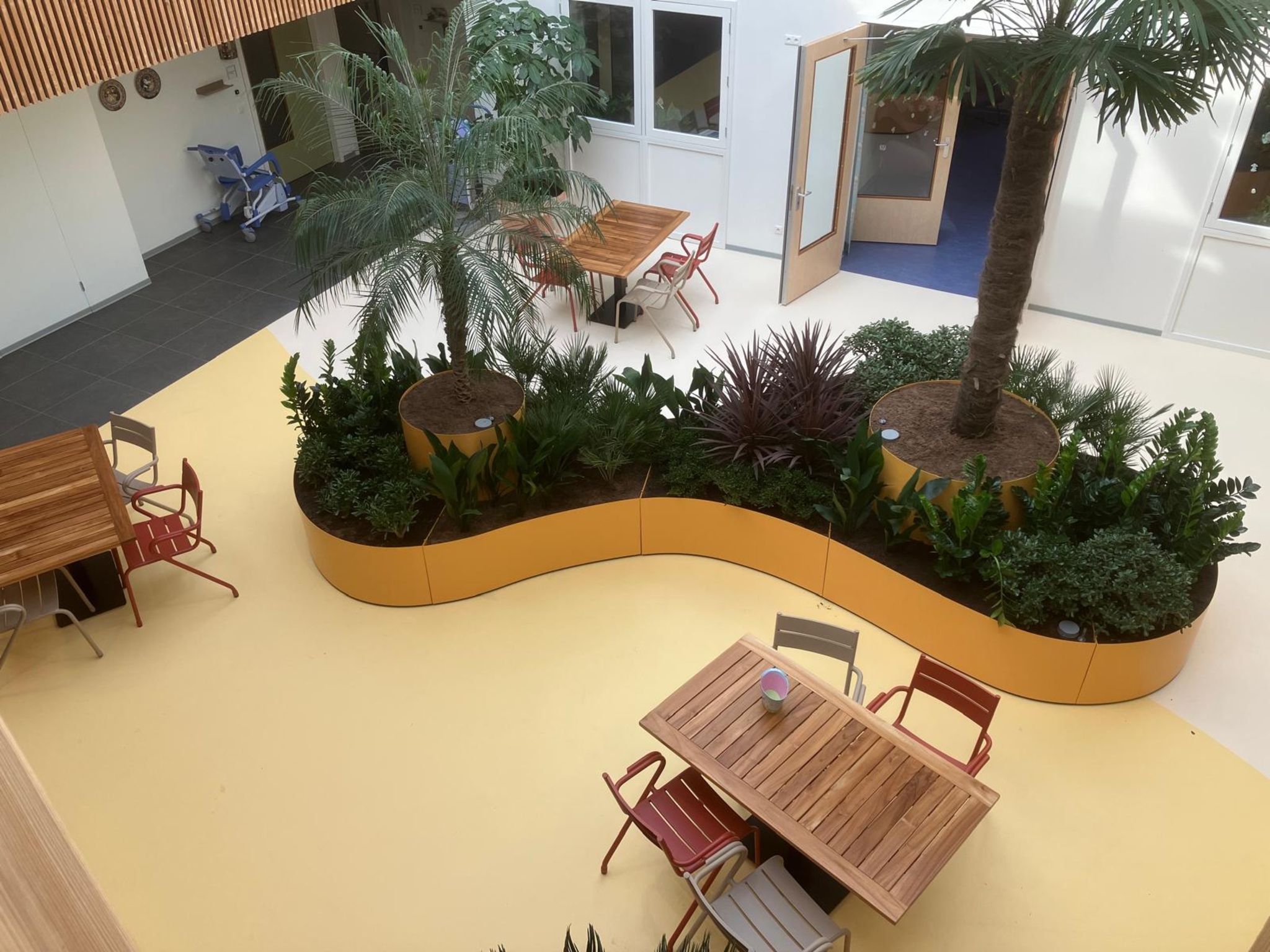 Wat een gezellige sfeer en groen is het geworden! De beide atriums van Woonzorg Hanzeborg in Lelystad zijn van saaie grijze ruimtes veranderd in twee kleurrijke vertrekken waar de bewoners elkaar ontmoeten, kunnen verblijven en bewegen. Ze genieten er van de groene sfeer die gemaakt is met kleurige plantbakken met kamerplanten en palmen die flink de hoogte in gaan. Ook de vloeren zijn veranderd van saaie grijze tegels in passende kleuren die goed bij de thema’s van de atriums passen: het beweegbos en de mediterrane ontmoetingsplek. Doordat het daglicht door het glazen dak komt zijn beide plekken heerlijk licht. Het zijn gezellige zonnige ruimtes geworden. Vanaf de eerste verdieping kijk je mooi van boven af op de ruimtes en kun je de toppen van de planten bijna aanraken.