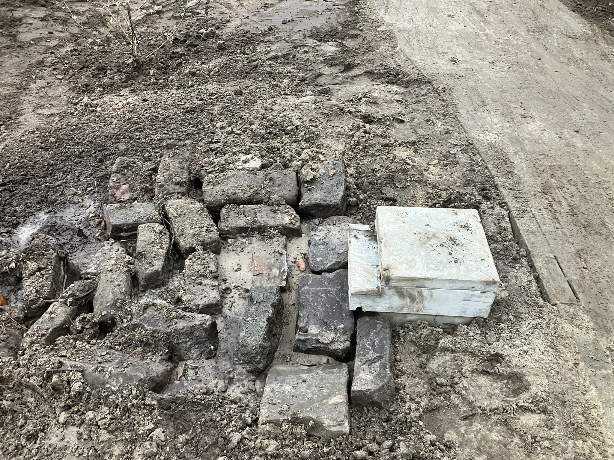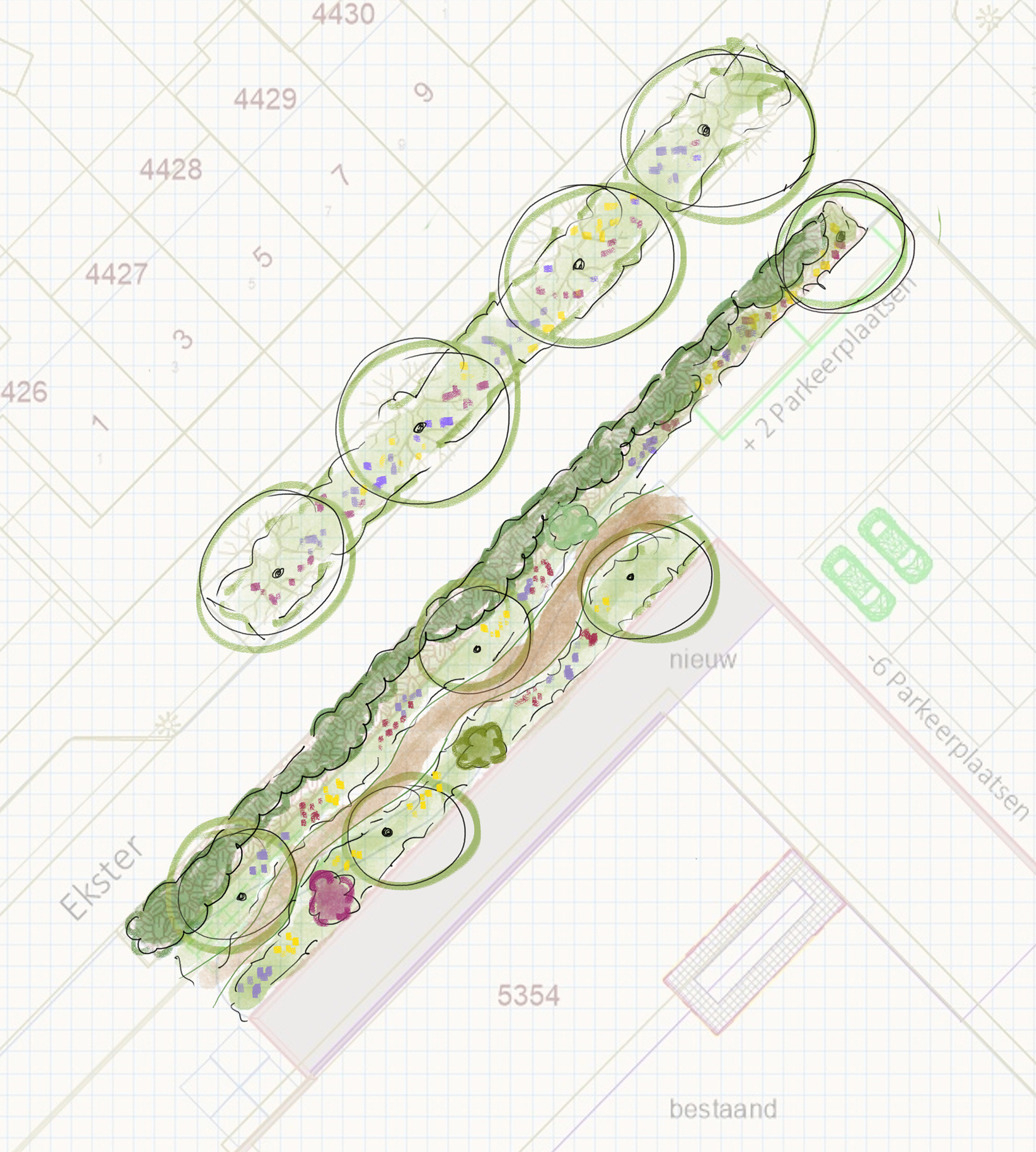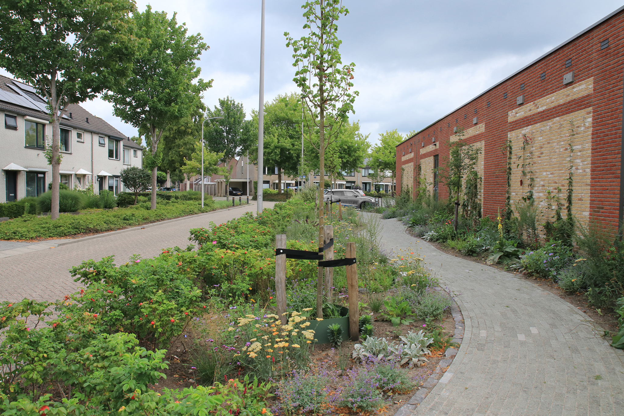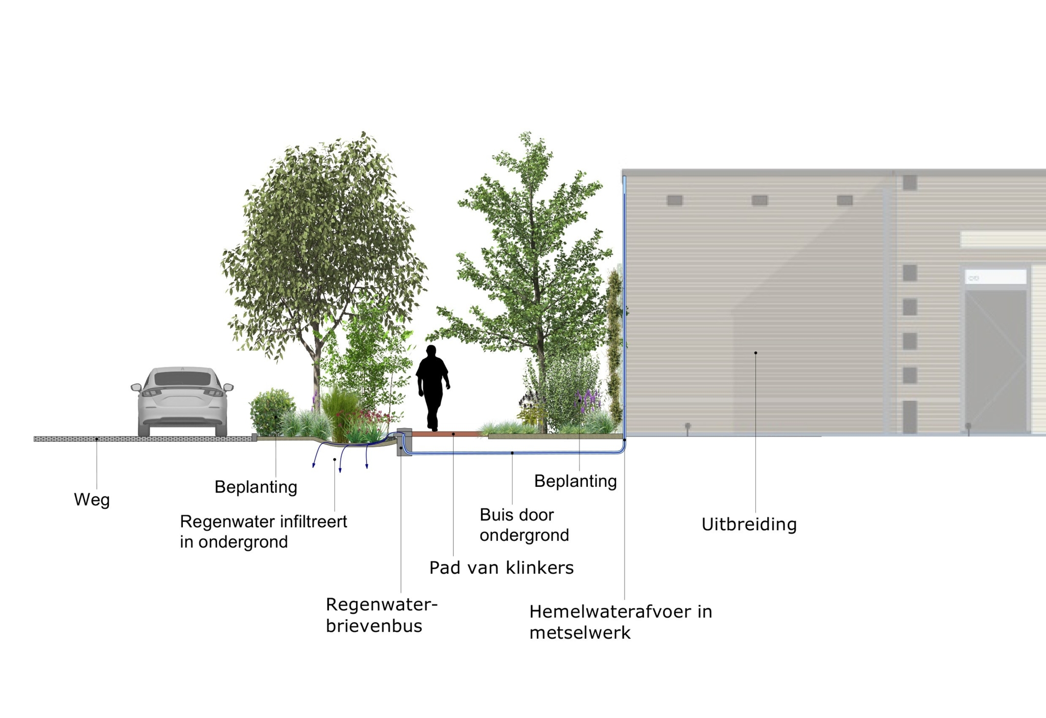 Het regenwater wordt afgevoerd naar lagergelegen delen in de beplanting, waardoor een kleurrijke wadi is ontstaan. De ondergrond bestaat uit grof zand waardoor het water gemakkelijk kan infiltreren in de bodem. Het stroomt via de regenpijp door een ondergrondse buis naar een regenwaterbrievenbus. Vandaar komt het water in een keienbedding en kan vervolgens doorsijpelen in de verlaging in de bodem tussen de planten. Hierdoor wordt het rioolstelsel ontlast en ontstaan er waterbuffers waardoor planten, bomen en struiken in tijden van droogte op zoek gaan naar vocht. Een haag van Rosa rugosa vormt een scheiding tussen de weg en de beplanting.