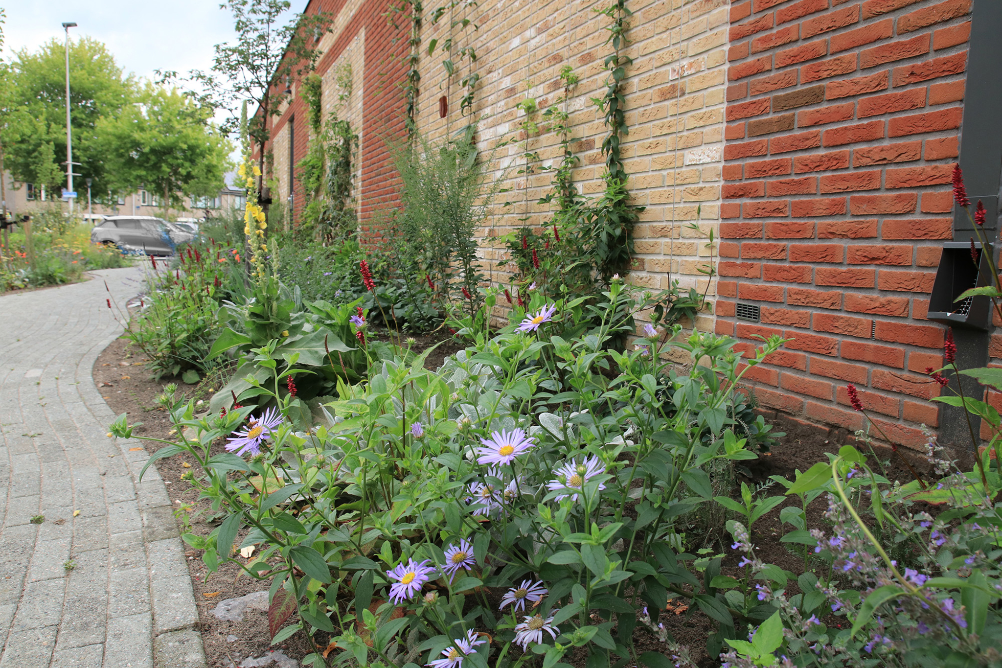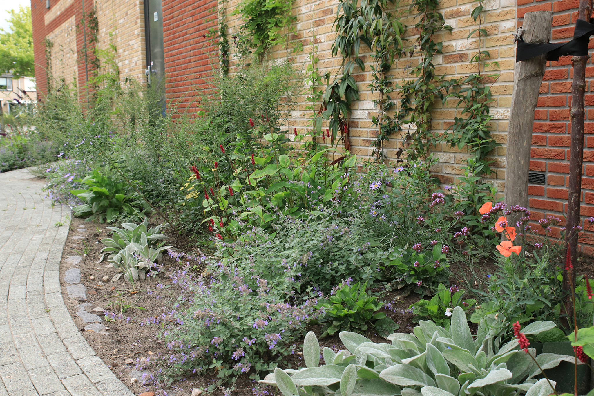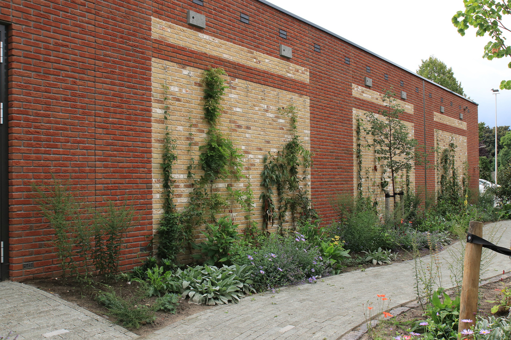 De vaste planten zorgen jaarrond voor een aantrekkelijk beeld met bloei en kleur in het groeiseizoen, heesters en bomen vormen een vast beeld. Klimplanten tegen de gevel versterken de groene sfeer, zorgen voor verkoeling van de gevel en functioneren als een airco. Ze creëren een nest- en schuilplaats voor vogels en insecten. De klimplanten hechten niet aan de muur; ze worden naar boven geleid met spandraden.