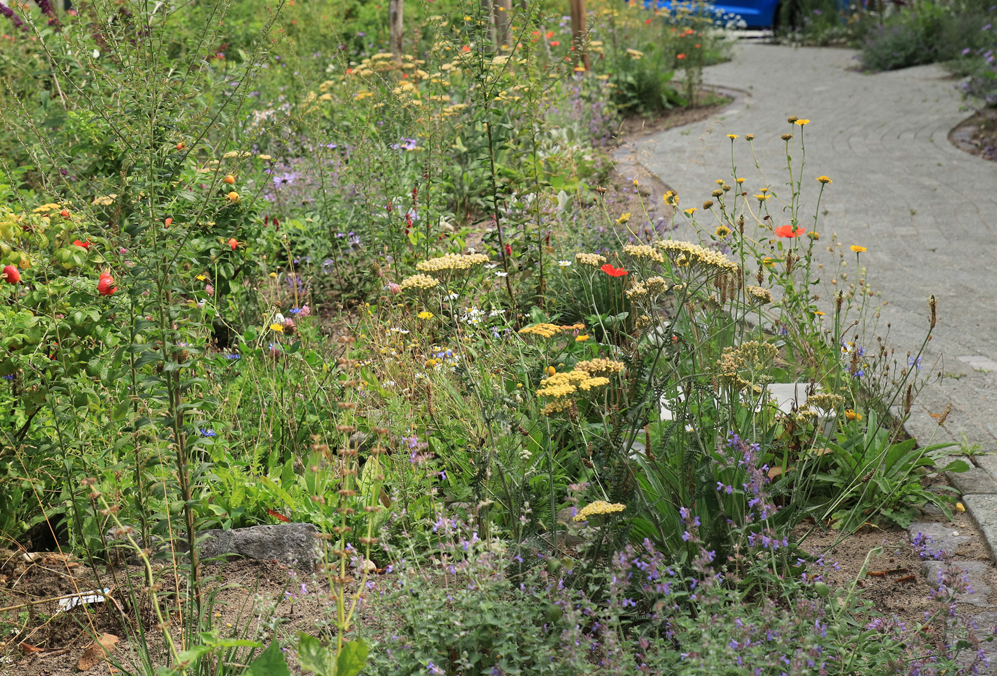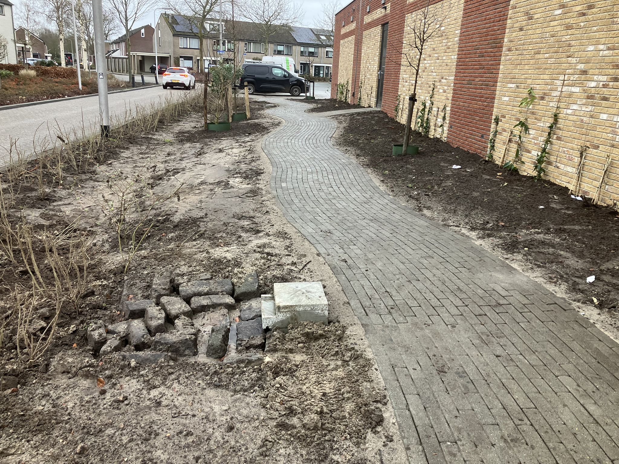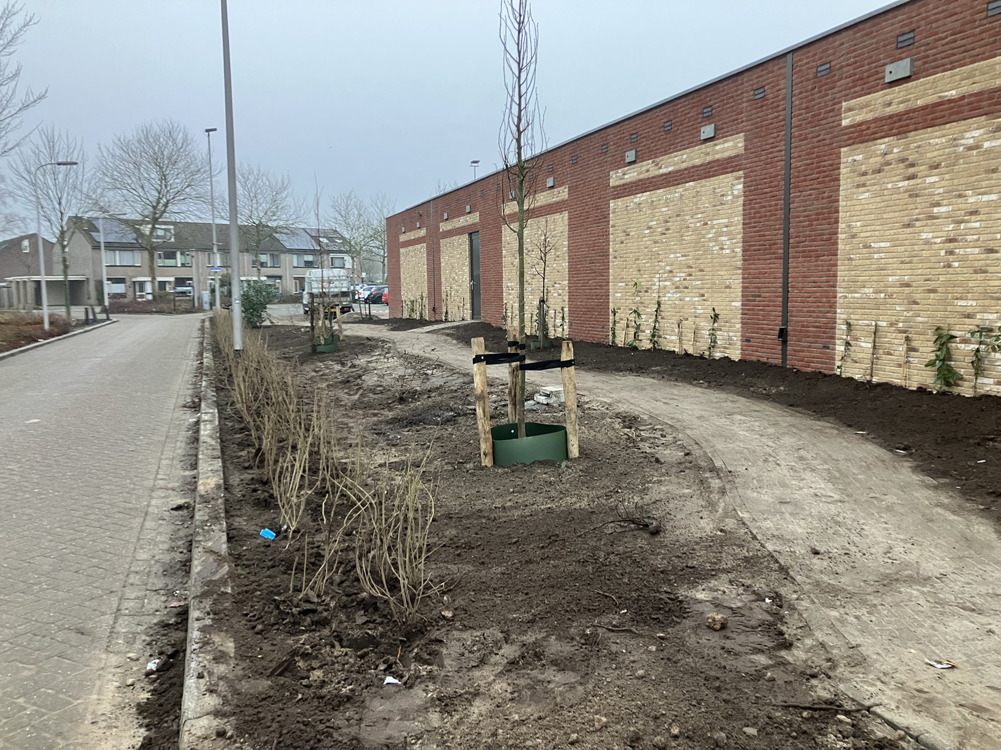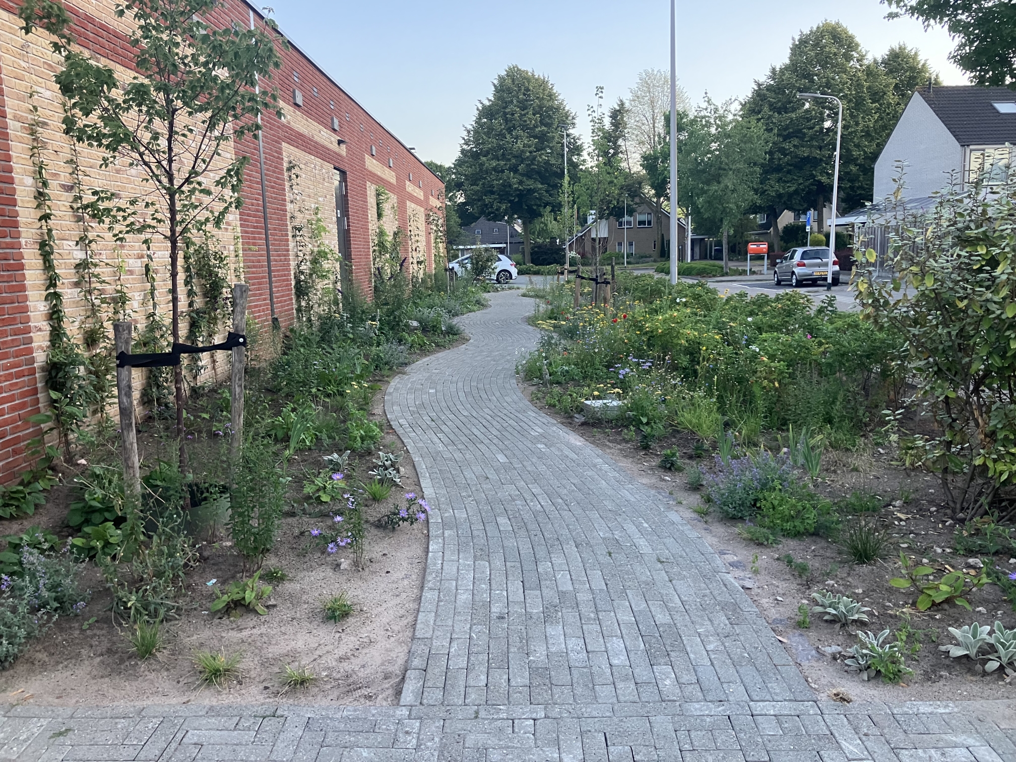 In het compleet versteende winkelcentrum Raalte Noord is na uitbreiding van de Jumbo De Kwartel de ruimte achter het bedrijfspand ingericht met beplanting. Wat ziet het er zo groener en kleurrijker uit! Een slingerend voetpad loopt door de beplanting waardoor je op weg naar de winkels kan genieten van de verschillende soorten bloemen en kleuren, rond fladderende vlinders en mussen. Voor hen zijn nestkastjes ingemetseld in de gevel. Afwisselende kleurrijke beplanting in de openbare ruimte vergroot de belevingswaarde van de omgeving en levert een bijdrage aan de biodiversiteit.